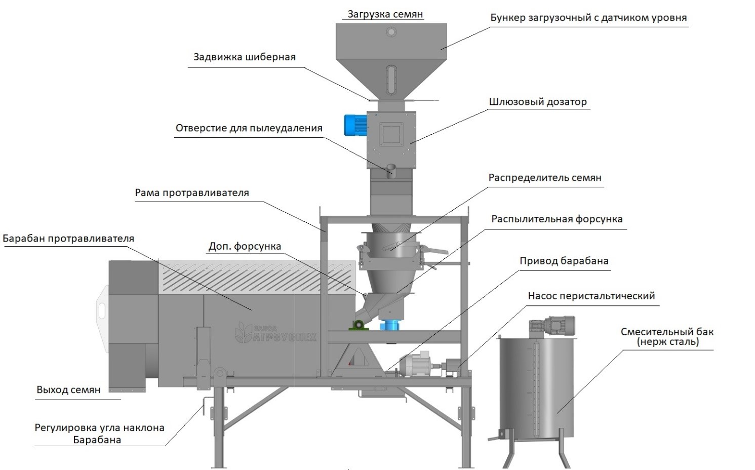 — Протравливатель комплектуется дополнительной форсункой для внесения инокулянта и по желанию заказчика можно оснастить системой для инкрустации семян;
